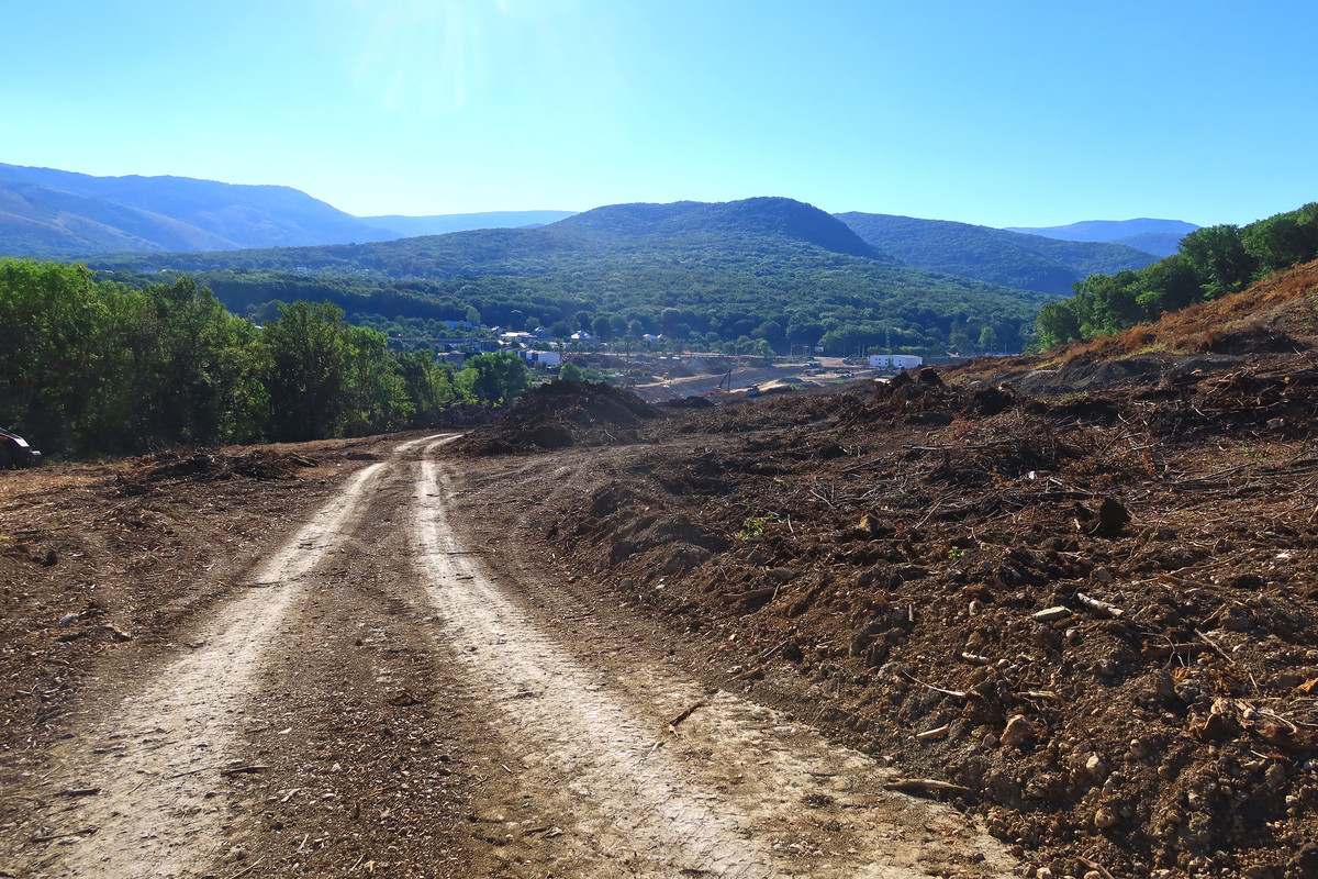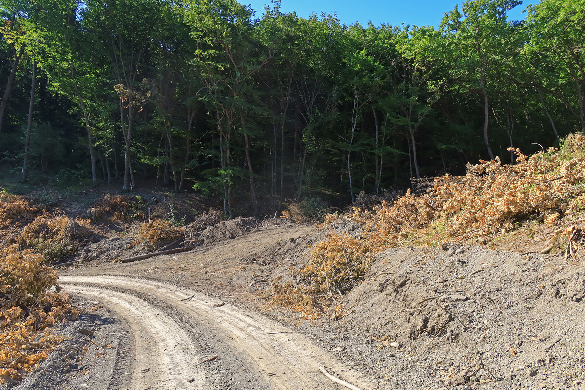 Прошел дачи, вышел к развилке, где плановая тропа с левым поворотом продолжает идти вверх, буквально несколько десятков метров - и всё, дорога упирается в завал (справа на дереве видна маркировка).