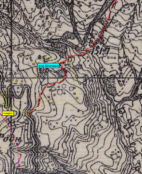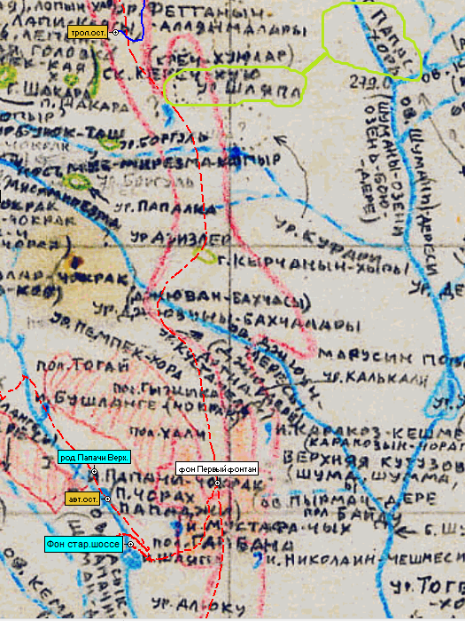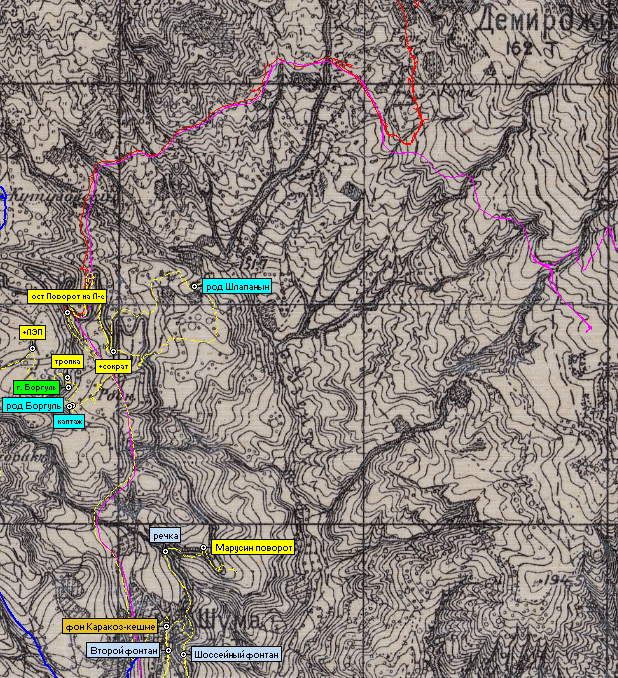 Поиски привели к роднику под старой заброшенной дорогой из Шумы в старую Демерджи. Она отмечена на верстовке 1890-х/1933 г. (см. красный пунктир на карте). Вдоль начала этой дороги есть старые дачи, а дальше вглубь леса сейчас намечено строительство нескольких новых. Дорога прямо над родником заросла и сейчас пробивается бульдозером либо в сторону трассы Лаванда-Лучистое, либо к новым площадкам строительства. Пока там тупик.