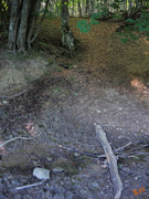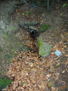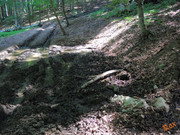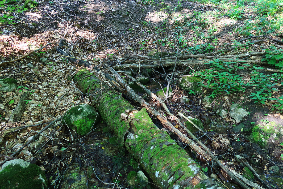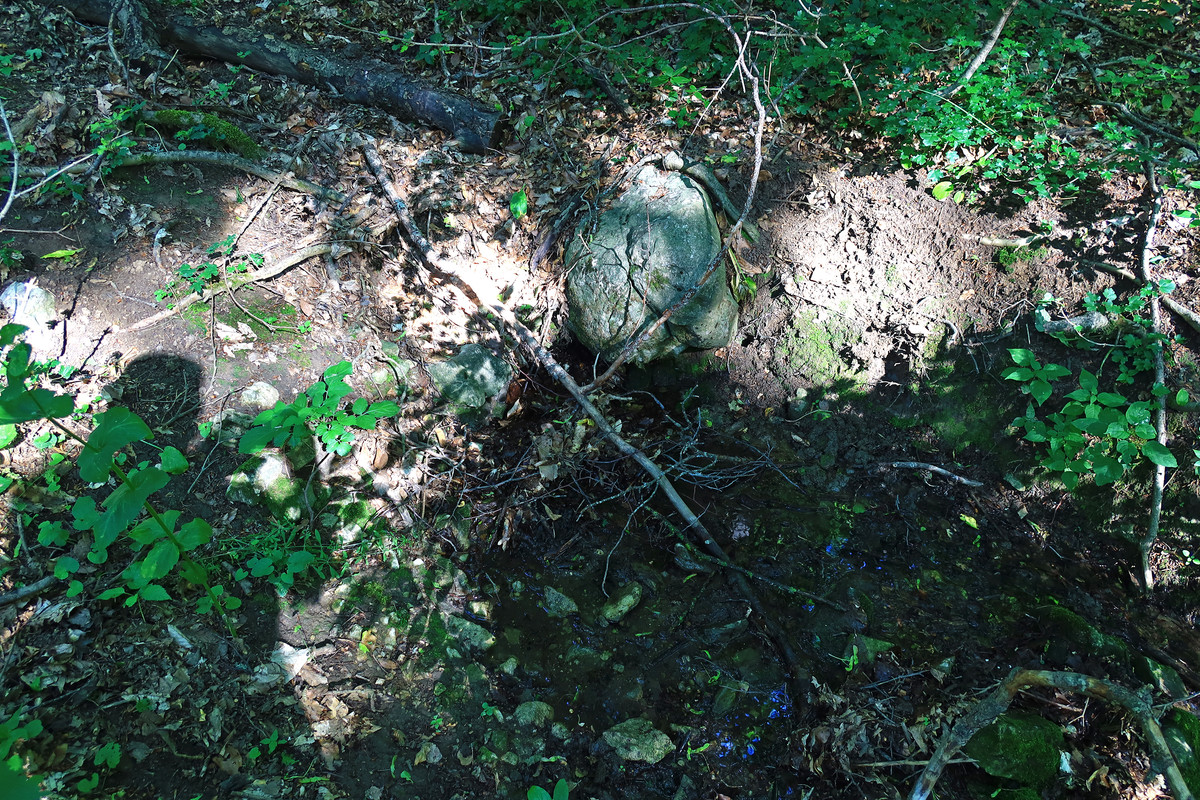Правый выход работает и образует ручей, протекающий через измерительный водослив 3 трубы. Завален упавшим буком.