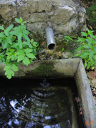 Внешний вид родника снова изменился. Когда это произошло, не знаю. Предыдущее обустройство по какой-то причине кого-то не устроило - вся каменная кладка над трубой ПНД, отводившей воду главного выхода, разобрана. Длинная труба осталась и лежит на поверхности, изогнутая дугой. Верхний конец трубы подставлен под сток воды левого выхода и немного придавлен камнями. Часть перехваченной воды отводится к останкам корыта.