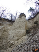 Второй механизм – возникновение земляных пирамид на межовражных гребнях. При углублении соседних оврагов и отступании их склонов гребень постепенно снижается, а та часть, которая прикрыта глыбой, сохраняется. Таким образом, обособление останца происходит развитием одновременно двух противолежащих склонов...