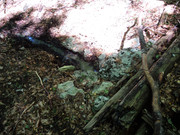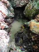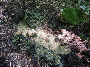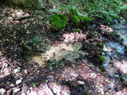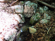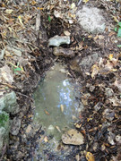 В 65 м. ниже по течению нашёлся ещё один, визуально более сильный, неблагоустроенный выход. Возможно дериват, но к этому моменту колбы для забора проб все закончились...