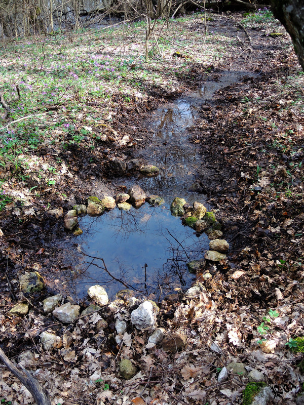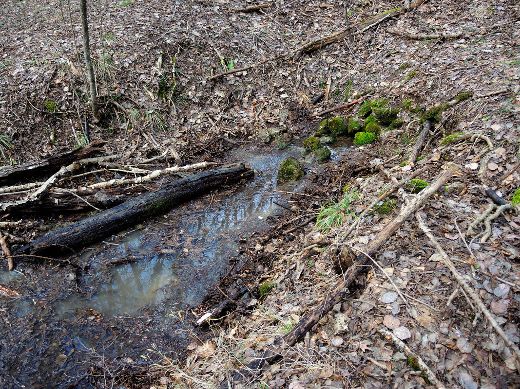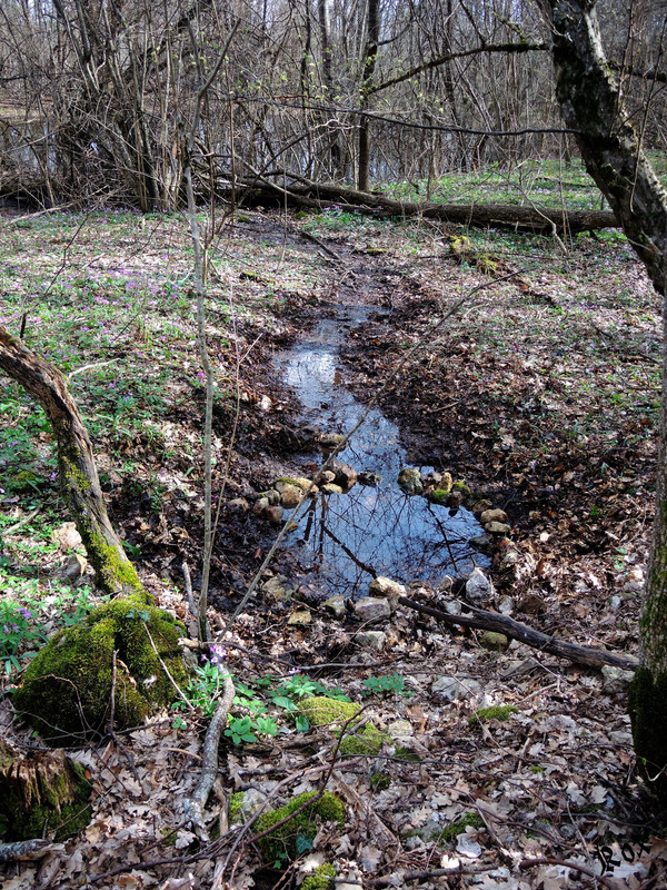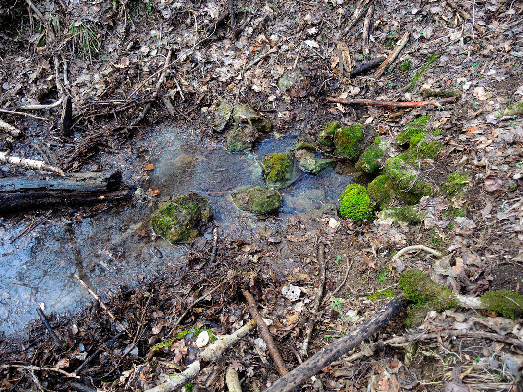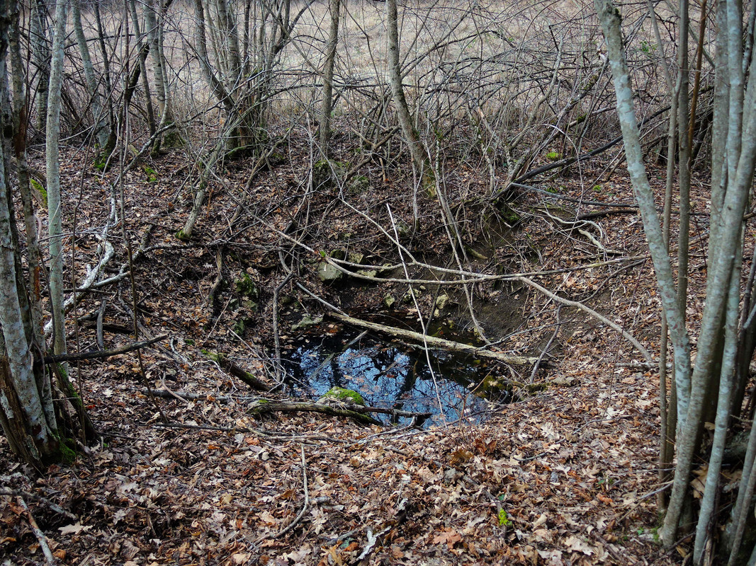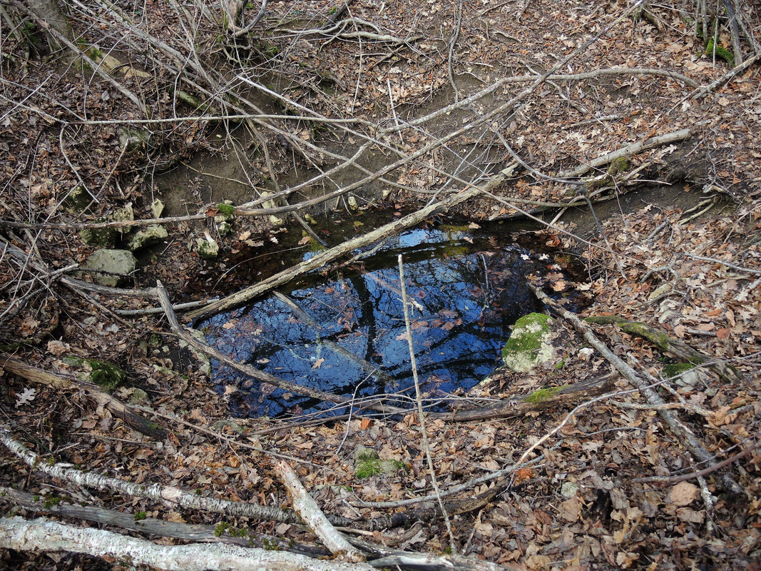 Родник когда-то был. Под ним была устроена земляная дамба и должен был получиться микро-водопой. Сейчас и родник и водопой занесены грунтом. Есть какой-то строительный мусор.