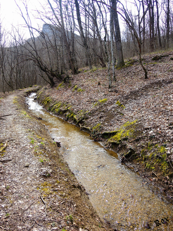 7) В дренажной канаве обочины под Розовым фонтаном необычное или обычное явление, какая-то сбросовая вода. Может это и есть сток ручья Хабанча-чокрака? К обочине он должен вытекать где-то около домика тяговой подстанции...