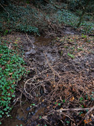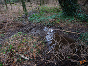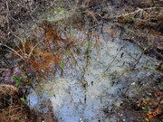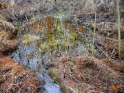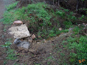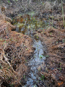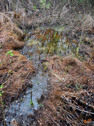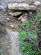Небольшой источник в виде лужи среди зарослей засохшей травы и хвоща. Ручей течет метров с десять, после чего стекает в арык.