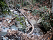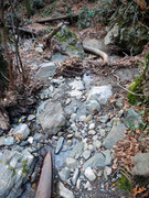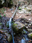 Труба от каптажного домика уходит на ЮВ, метров через тридцать она соединяется с другой трубой, которая проявляется на поверхности галечных наносов в русле р. Кара-Узень в точке слияния с боковым оврагом. Через несколько метров, в месте удалённого фрагмента старой прохудившейся трубы, который валяется рядом,  к водотоку подсоединена ПНД труба, забирающая только лишь небольшое кол-во воды, в то время как основная часть потока изливается в русло. И старые трубы, и новые уходят вдоль русла в юго-восточном направлении.