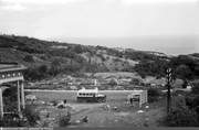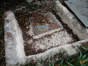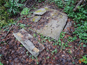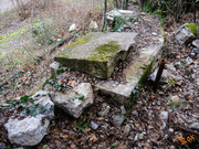 руины ограды сквера и входа в него, оформленного парой ступенек с двумя архитектурными бетонными элементами в виде волют по бокам,